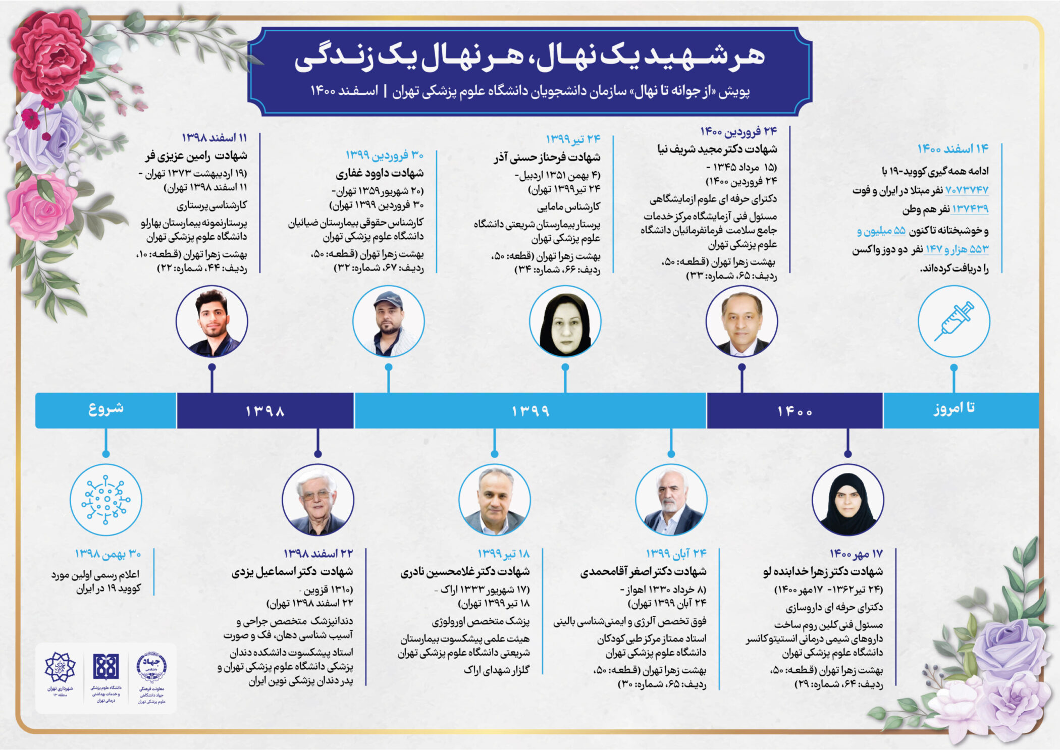 در طول دوران همه گیری کووید در ایران حدود ۳۰۰ نفر از کادر درمان جان خود را در مقابله با این ویروس از دست دادند و به مقام شهادت نائل آمدند. هشت نفر از آنها جزئی از خانواده بزرگ دانشگاه علوم پزشکی تهران محسوب می شدند.